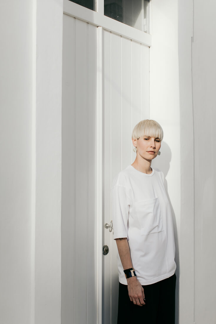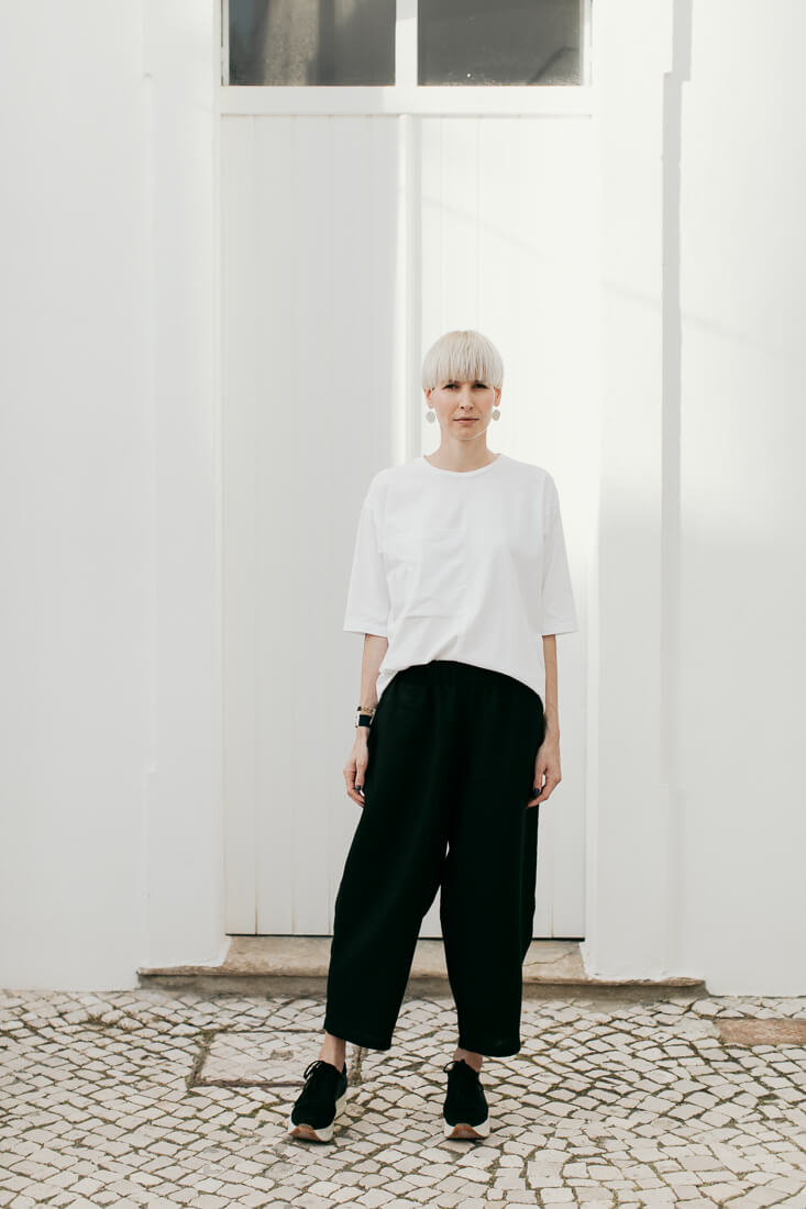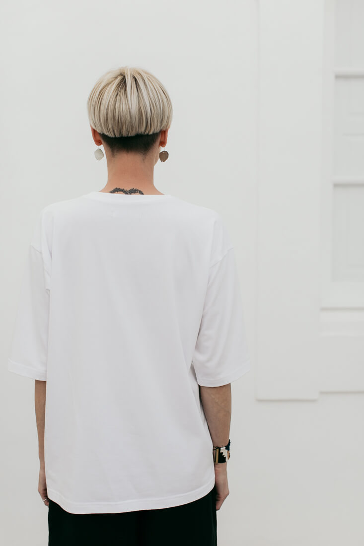 Sleeves slightly elongated and lowered. Oversized. Finished with a round neckline.