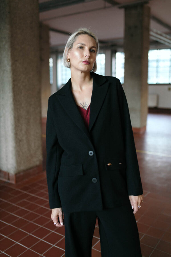 Designed on the OXI blazer base – it has wider lapels and a cut in the back. Fastened with two buttons. Fake pockets in the front – so the material won’t get stretched out.