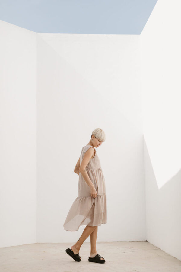 The material is slightly see-through. It’s hemmed with a viscose lining, knee length, emphasizing the transparency and keeping it comfortable to wear. It’s light, airy, drapes on the body beautifully.