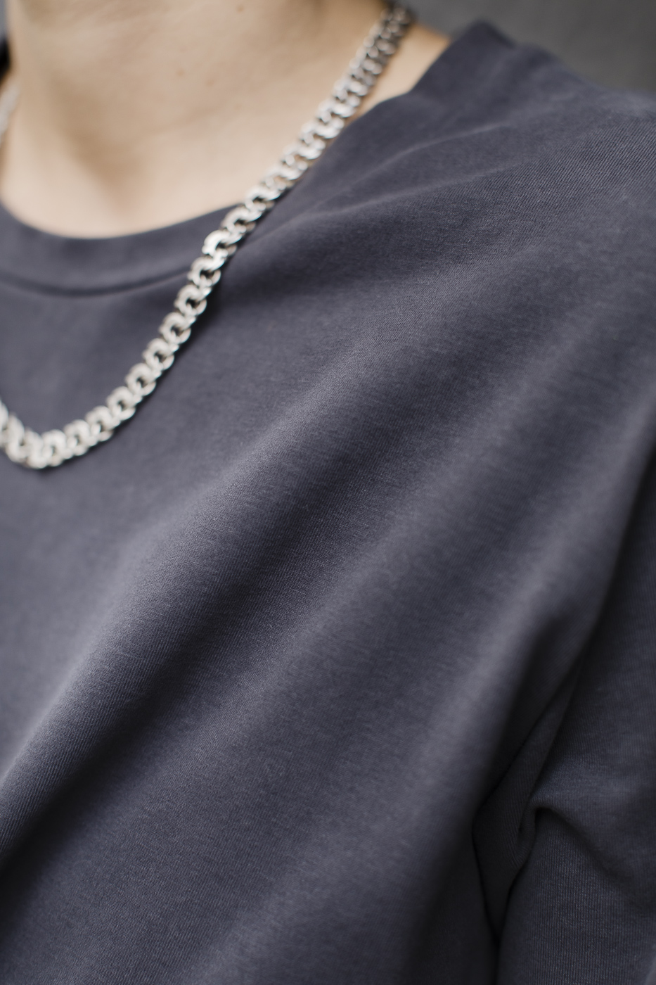 Oversized. Lowered arm. Slightly longer sleeves. Neckline finished with a pleat.