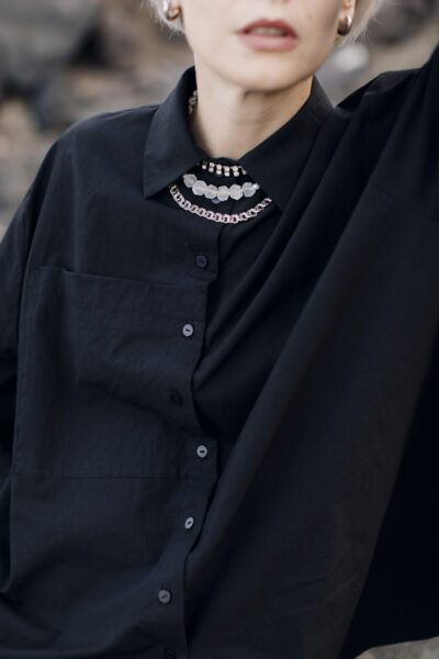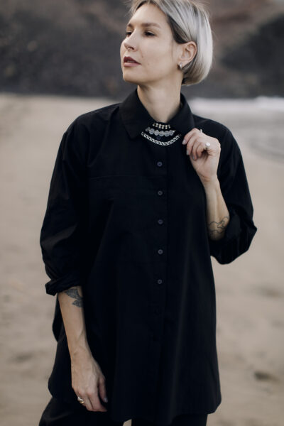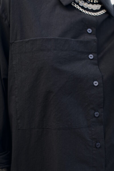 The largest out of PULPA’s shirts. It has a big, ornamental breast pocket and deep, rounded cuts on the sides. Fastened with black buttons.