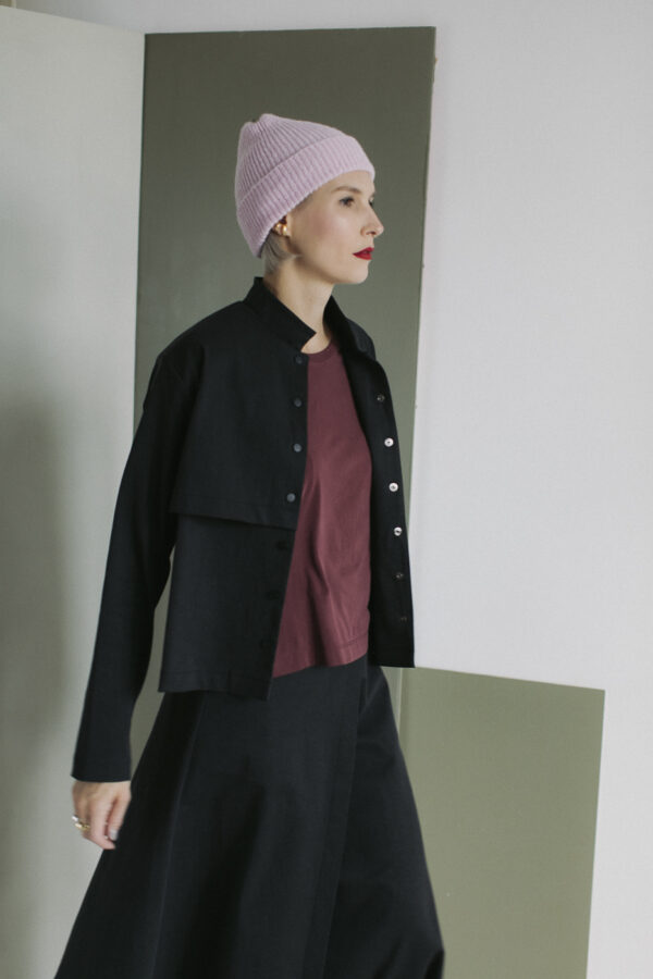 Made from thick cotton and lyocell blend with an elastane addition. Very nice to touch, very wearable. It has a suede-like finish.