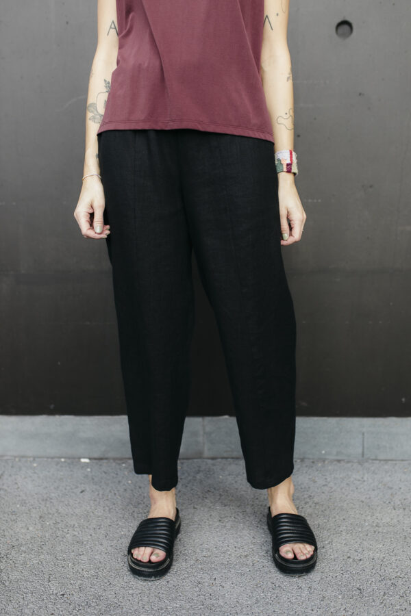 All linen clothes should be slightly baggy. The fabric hasn’t got any synthetic additions, which makes it stiffer. If the trousers fit tight, the material will rub and eventually have holes in it, and the seams can rip.