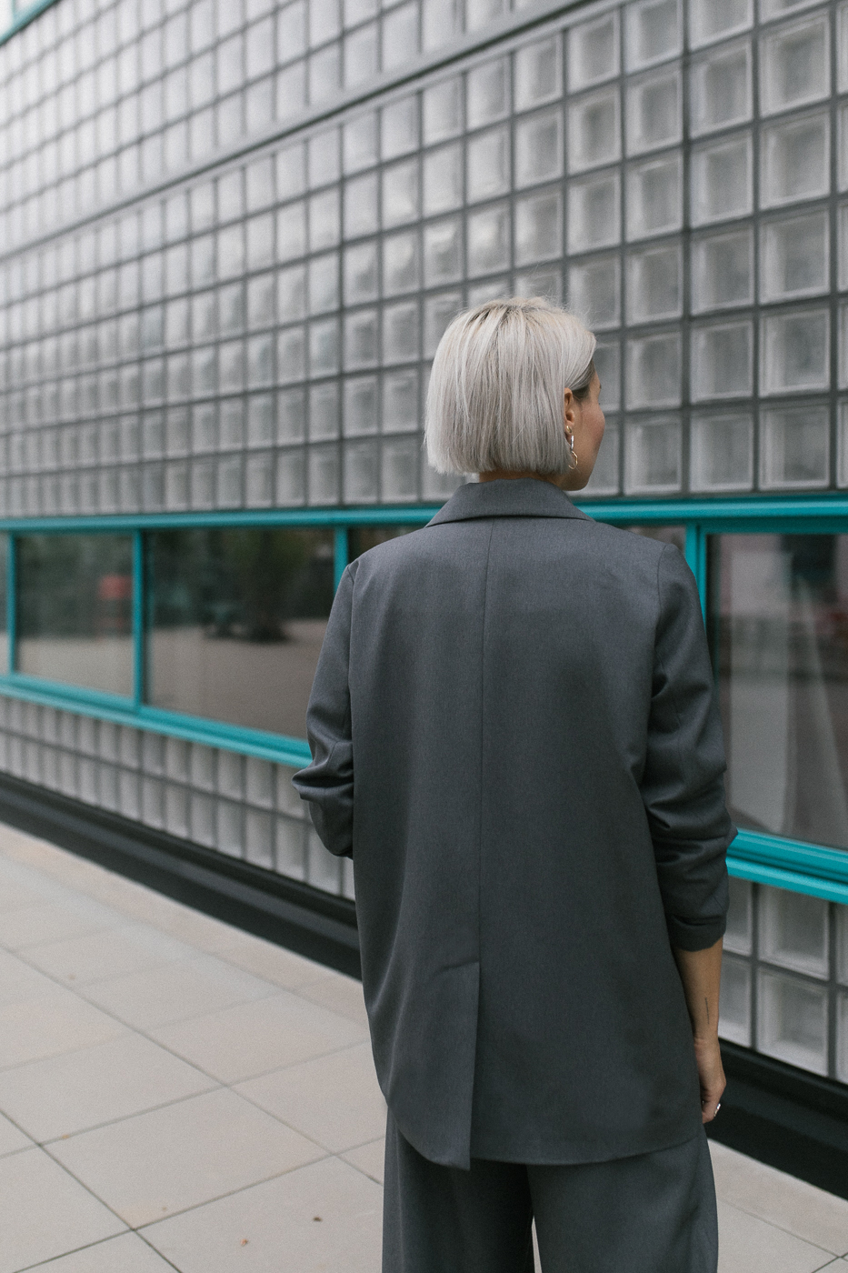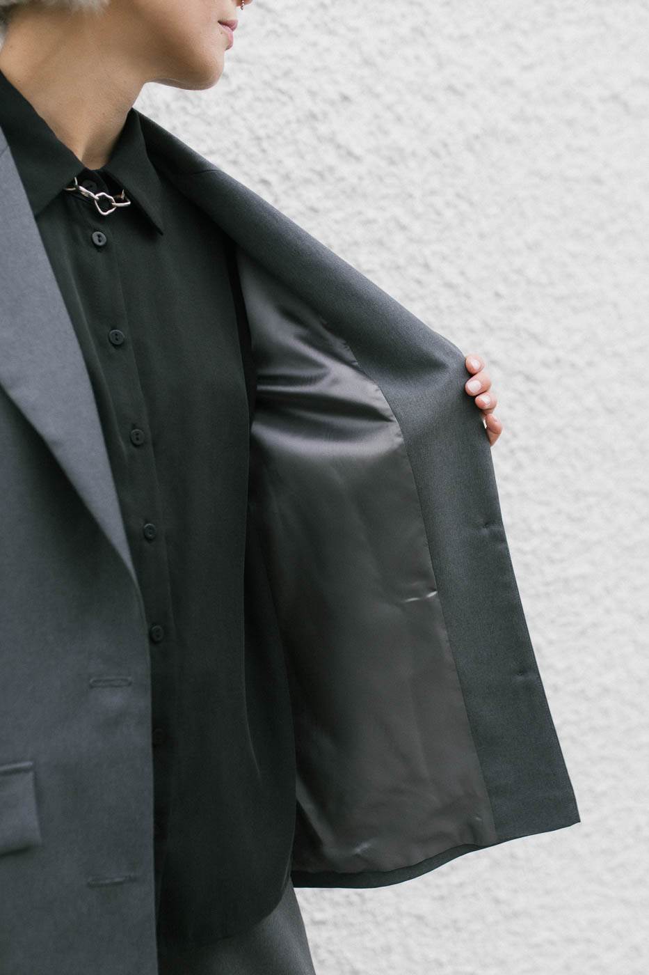 Marynarka AMY jest stworzona na bazie marynarki OXI. Jest tej samej szerokości i długości. To, co ją różni, to szersze klapy oraz rozcięcie z tyłu.