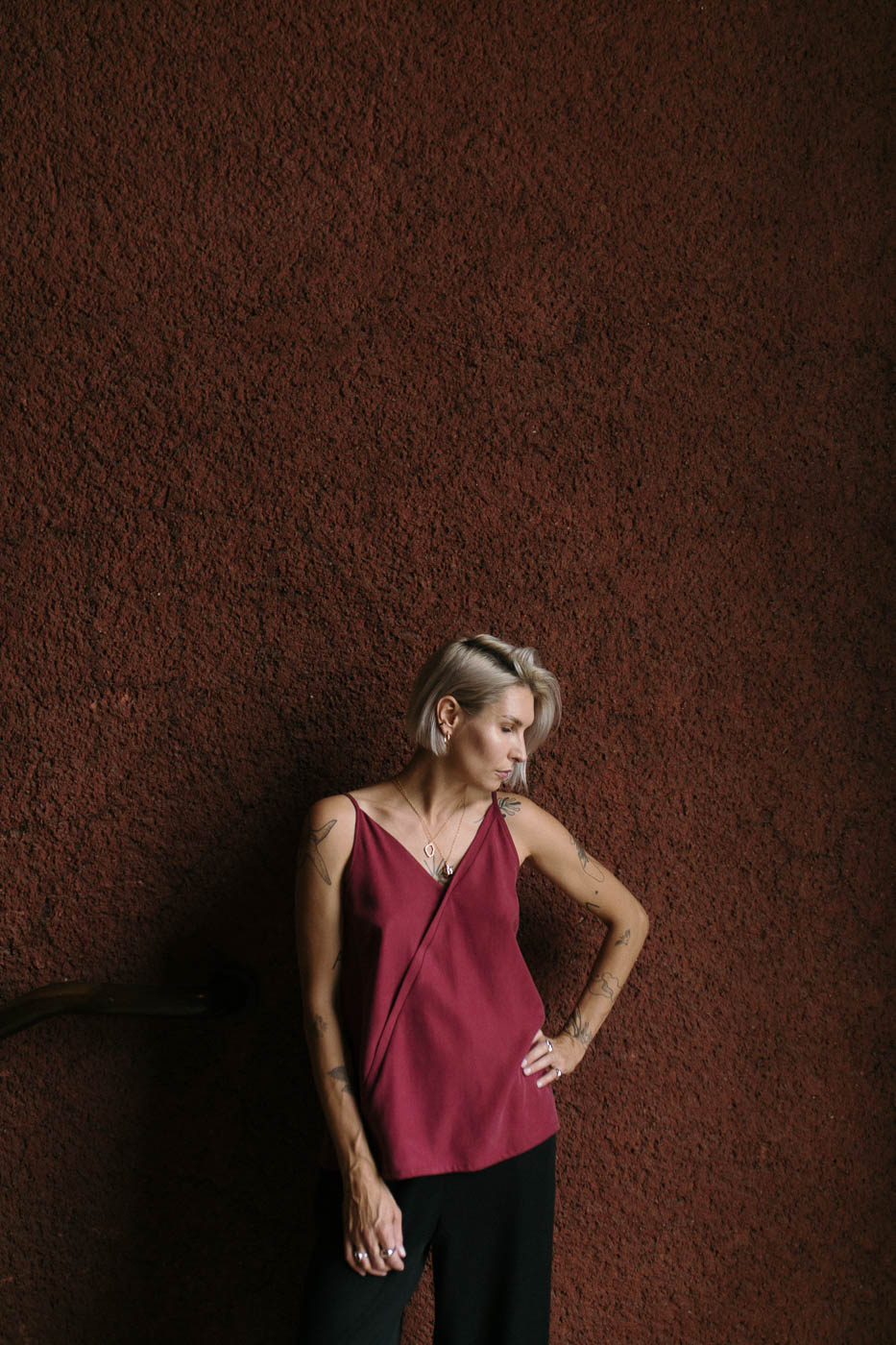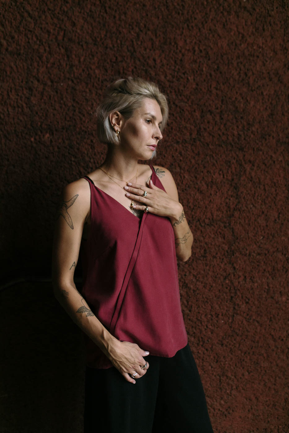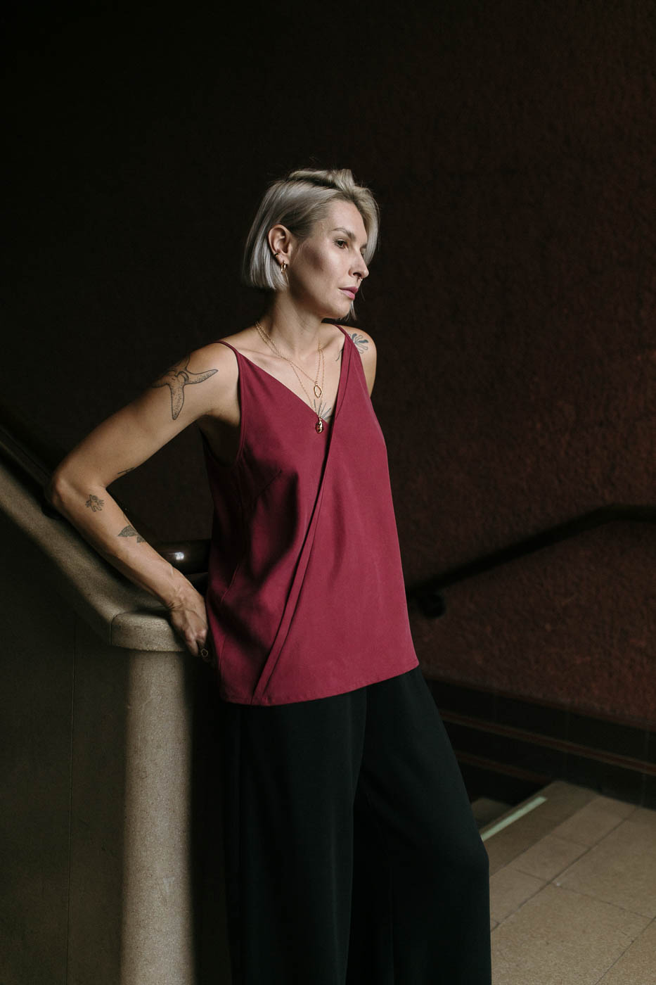 Top uszyty jest z lyocellu, który pięknie się układa, leje, elegancko odbija światło. Materiał ma delikatny, zamszowy włosek.