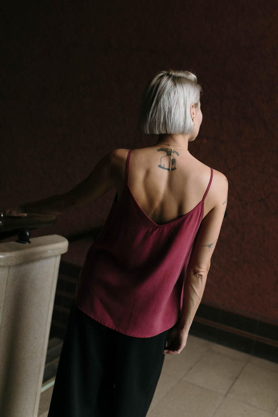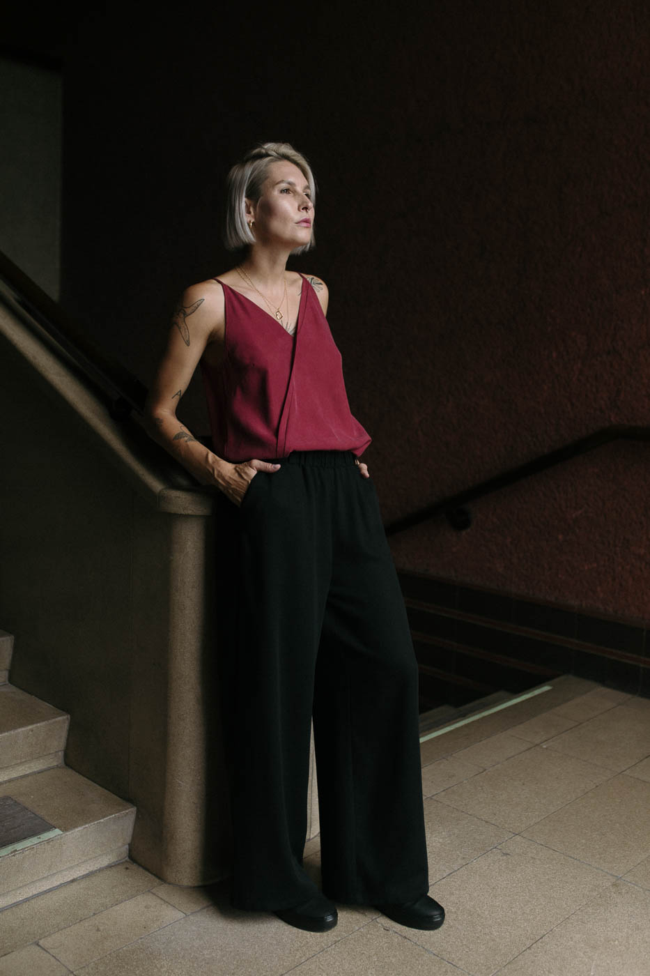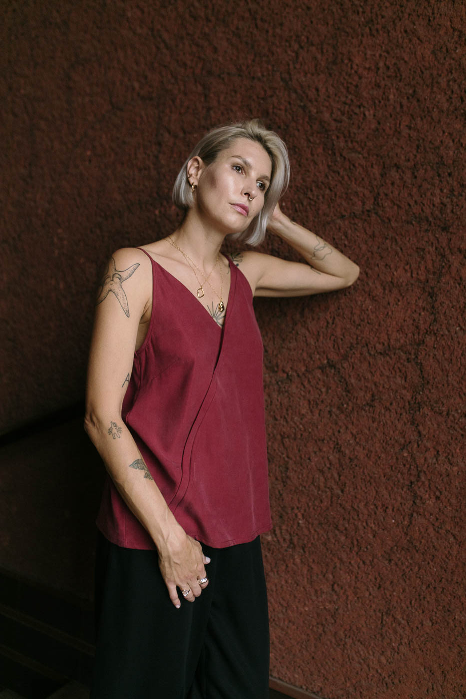 Top uszyty jest z lyocellu, który pięknie się układa, leje, elegancko odbija światło. Materiał ma delikatny, zamszowy włosek.