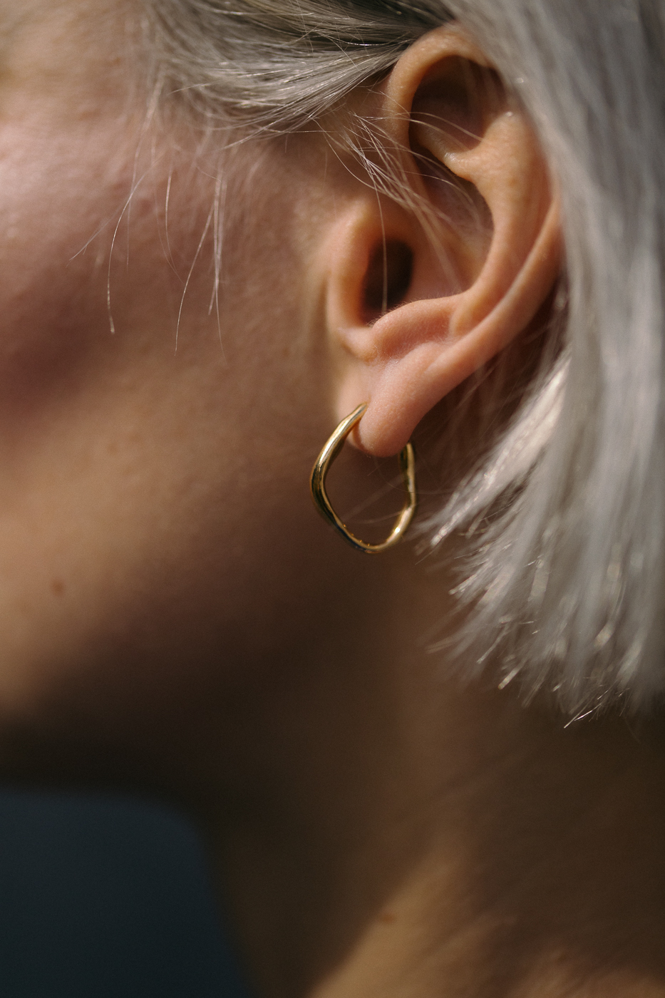 Ta wersja kolczyków PEARL to kontur perły – nieregularne, organiczne linie odlane w srebrze i następnie złocone, mocowane na sztyfcie.