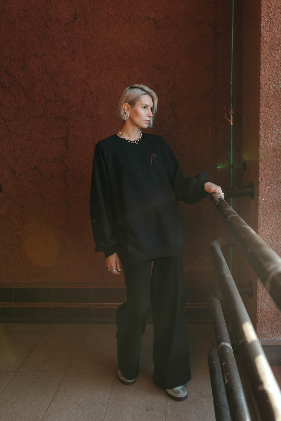 Bawełniana bluza o oversize’owym kroju. Raglanowe szerokie rękawy zakończone ściągaczem.