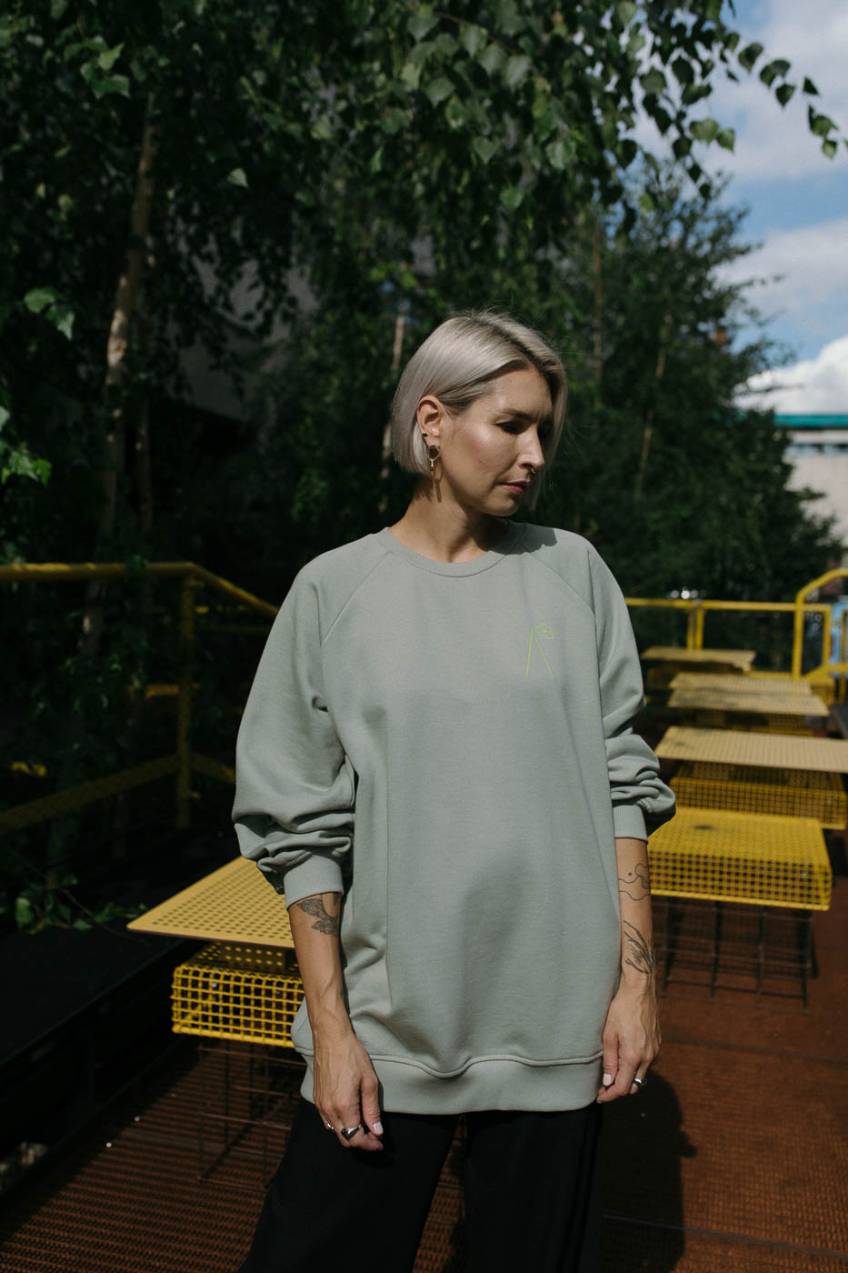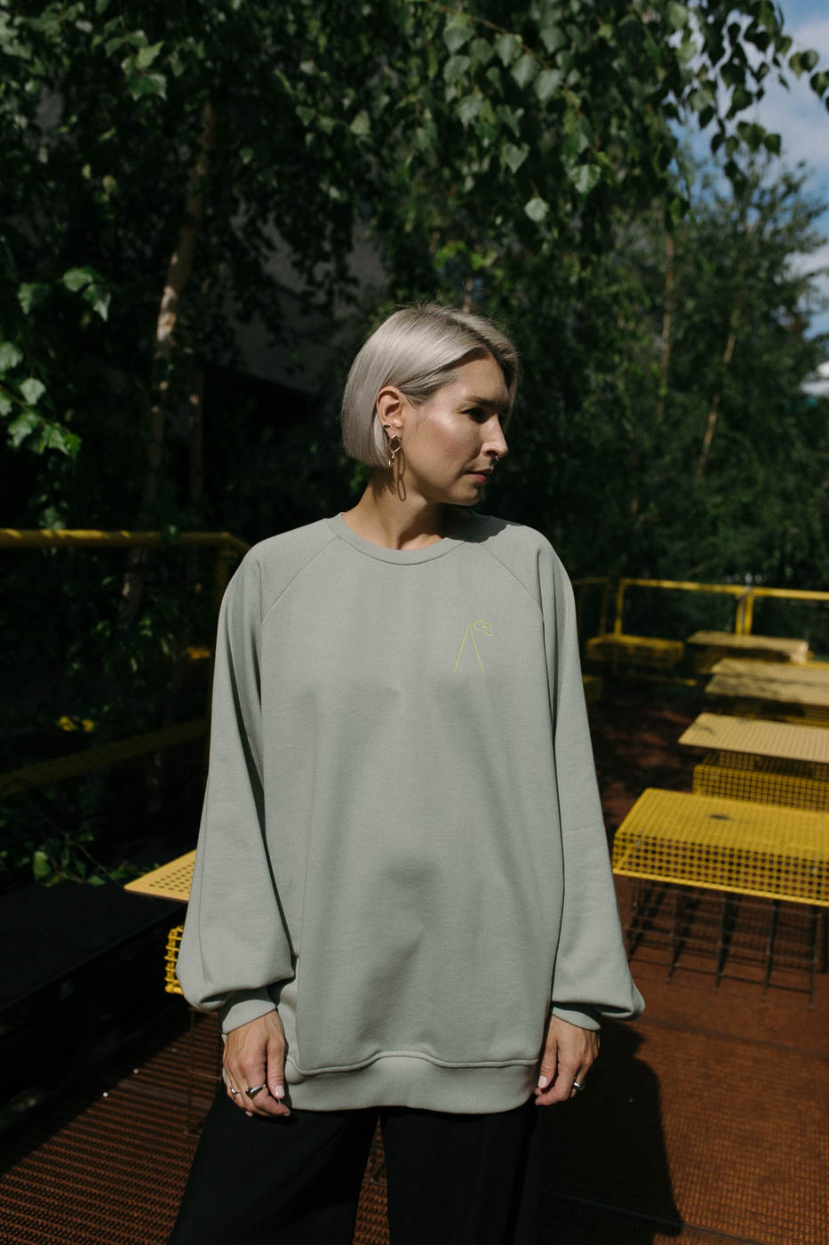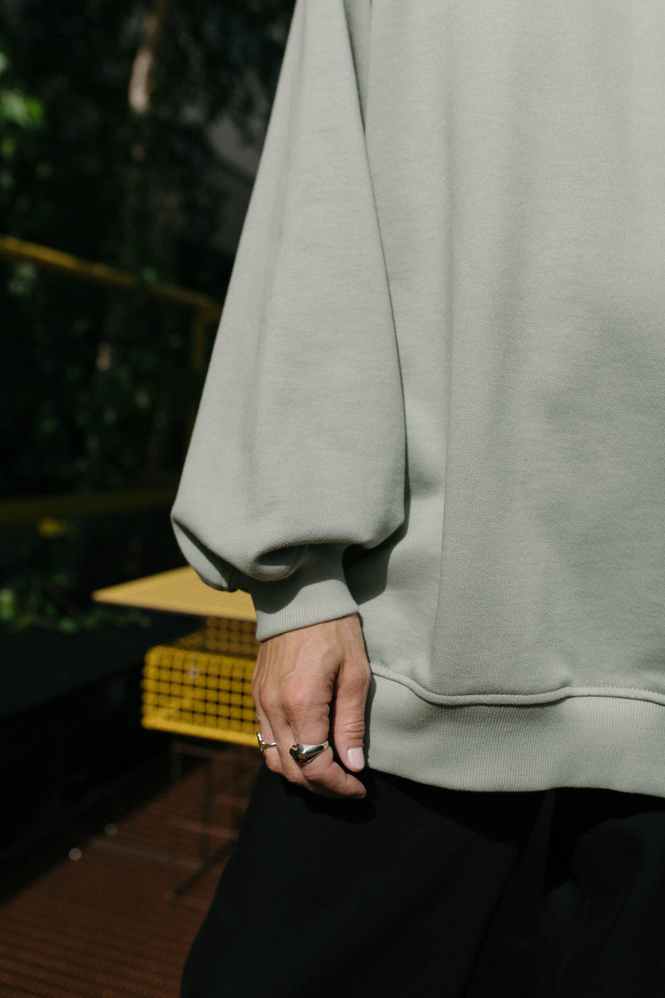 Bawełniana bluza o oversize’owym kroju. Raglanowe szerokie rękawy zakończone ściągaczem.