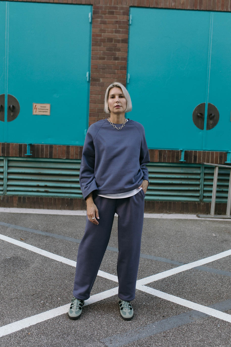Spodnie dresowe z grubej dzianiny bawełnianej w kolorze fioletowo-niebieskim.