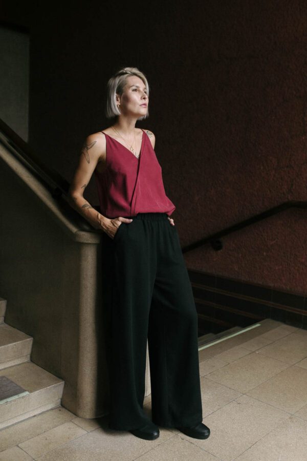 Spodnie te uszyte są z lyocellu, który pięknie się układa, leje, elegancko odbija światło. Materiał jest mięsisty, gęsto tkany po skosie, z widocznym splotem.