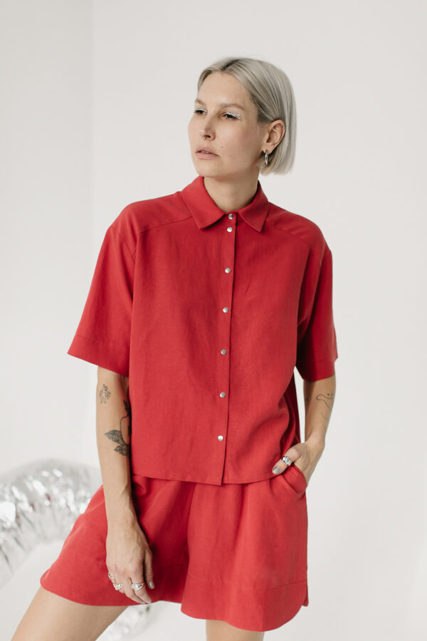 Koszulę GOYA można śmiało połączyć z szortami HI ROMA /coral red lyocell+linen/ i mieć monochromatyczny komplet, który będzie wyglądał, jak letni kombinezon.