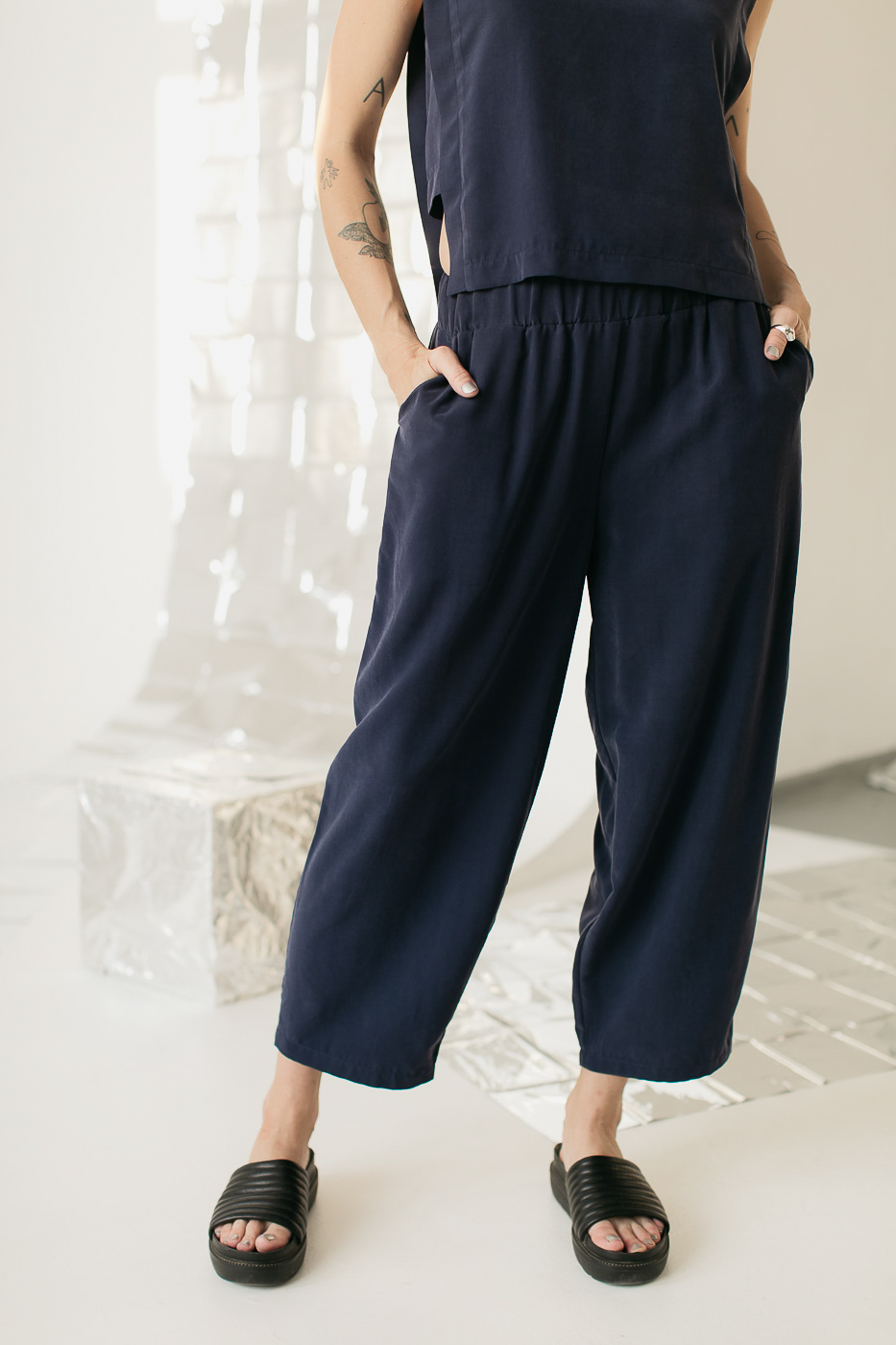 Granatowe spodnie z mieszanki modalu z rayonem.