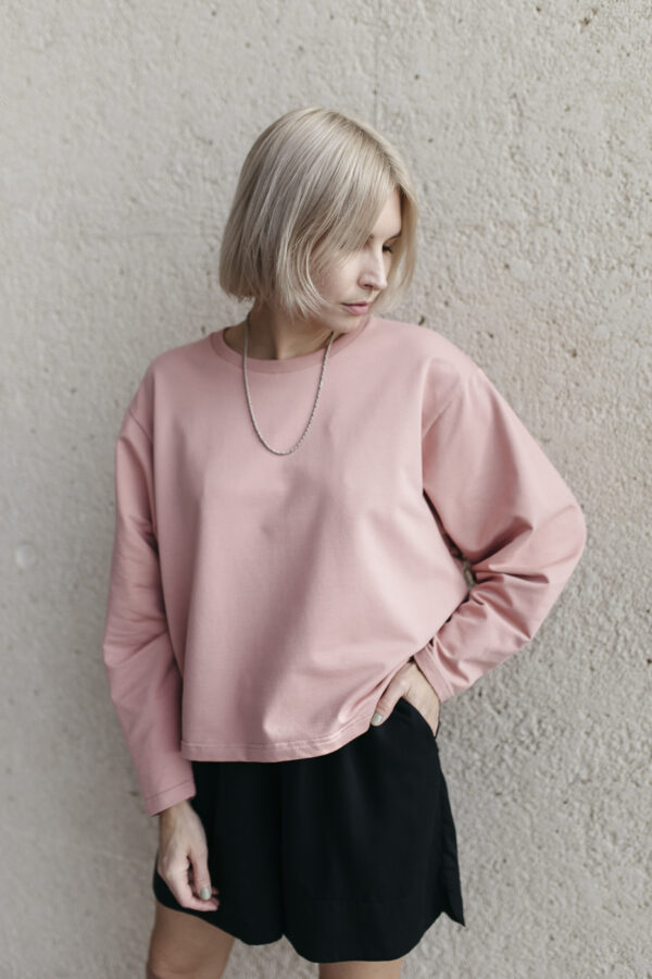 Bluza dobrze się łączy z sukienkami, spódniczkami, dłuższymi bluzkami pod spodem. Albo noszona jakkolwiek. Po prostu, bardzo uniwersalny fason.