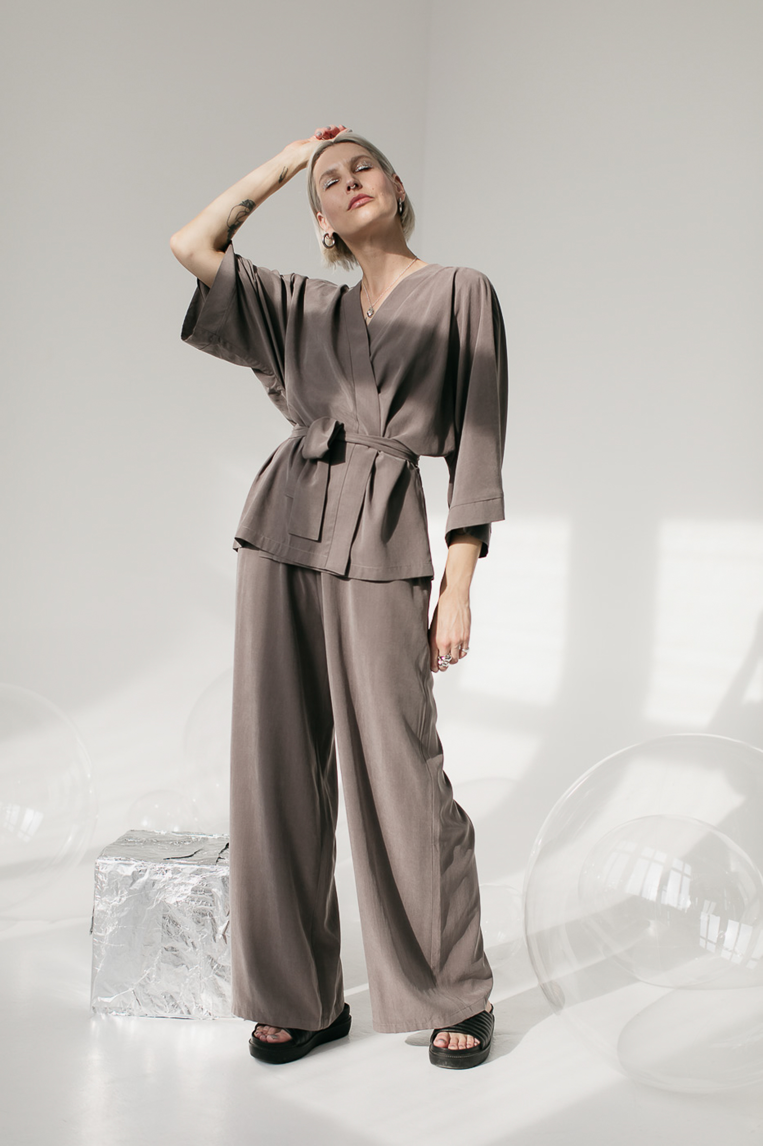 Bluzkę UMA można śmiało połączyć ze spodniami FIKA /earthy graphite rayon/ i mieć przepiękny monochromatyczny komplet.