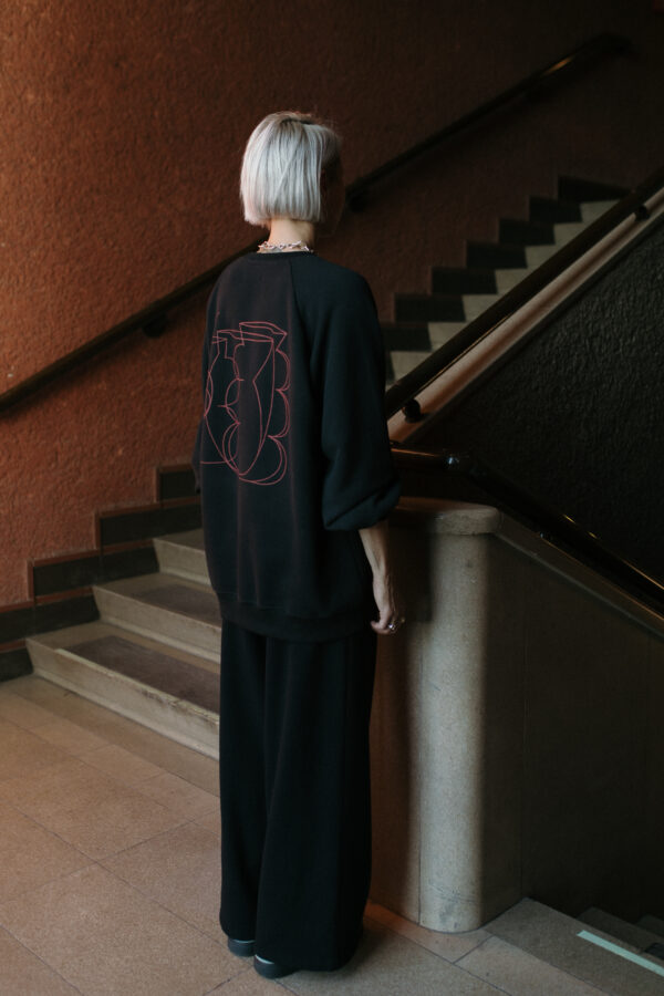Bluza powstała we współpracy z wrocławską artystką Anią Szczerbą. Ania zaprojektowała wzór specjalnie dla Pulpy (możecie go też zobaczyć na tiszercie i chustkach VASES – i mieć wazoników komplet).