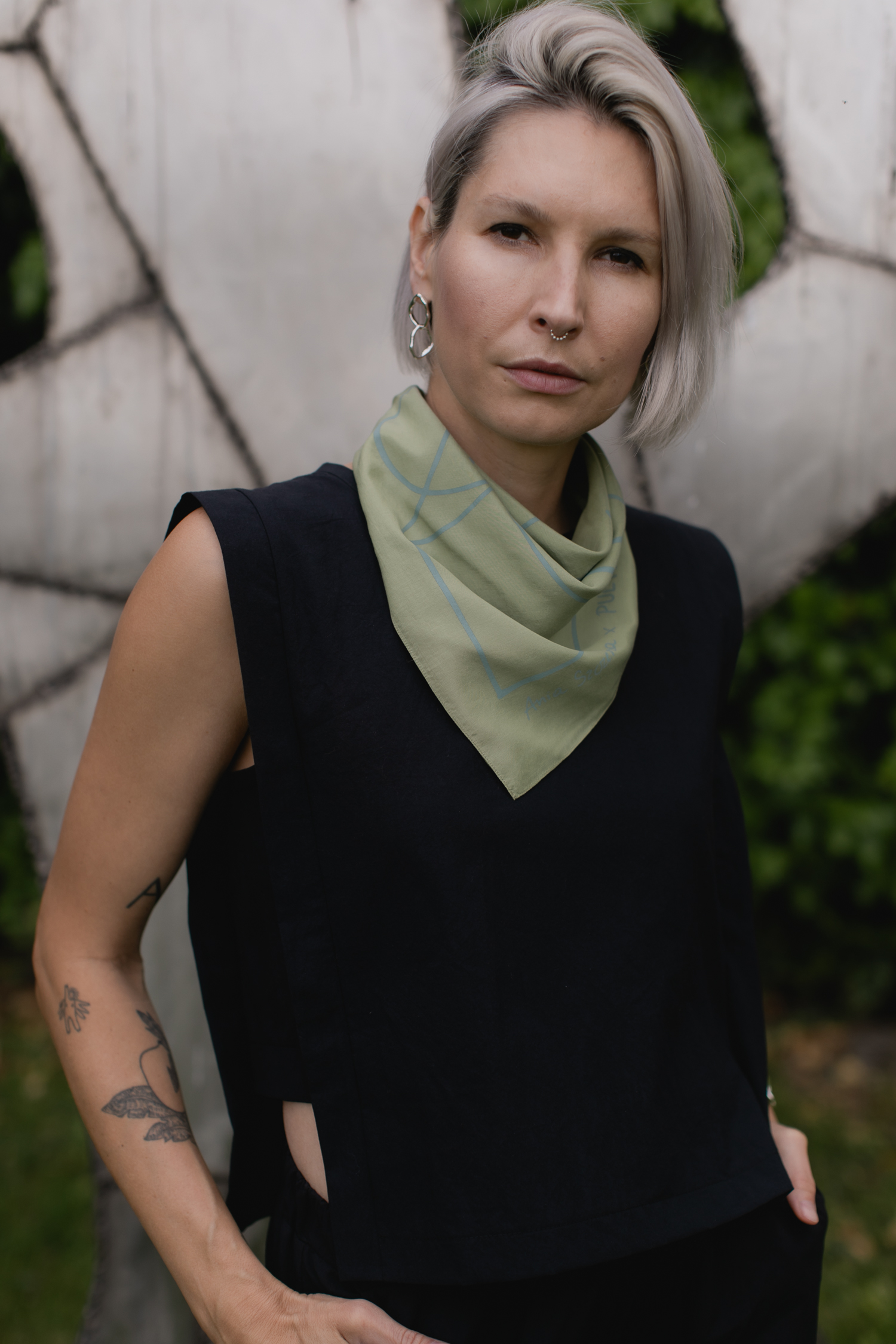 Chustka powstała we współpracy z wrocławską artystką Anią Szczerbą. Ania zaprojektowała wzór specjalnie dla Pulpy i specjalnie pod nadruk na chustki. Nadruk został wykonany metodą sitodruku w małej wrocławskiej drukarni. Razem z Anią wybrałyśmy kolory zarówno tkanin, jak i nadruków. Nie był to proces łatwy ani szybki 😉