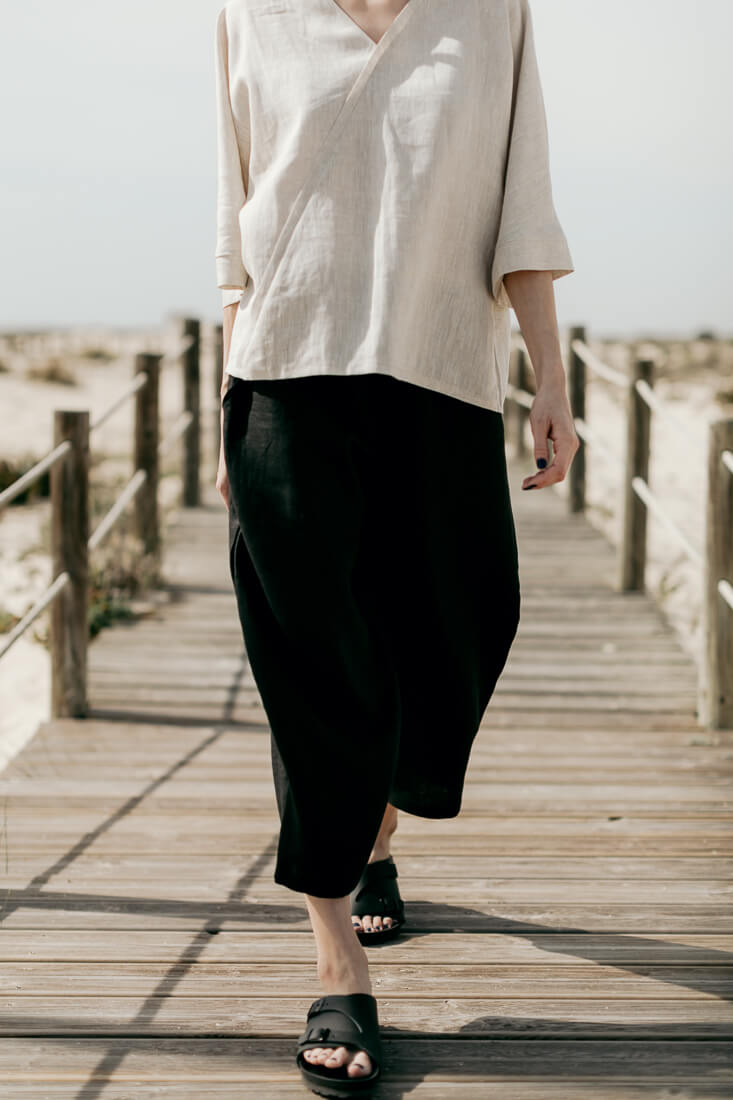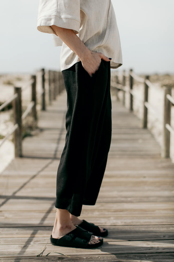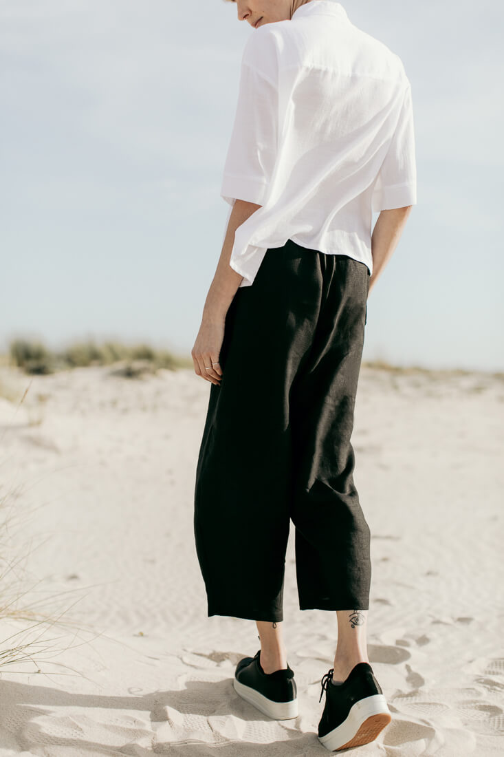 Wszystkie lniane spodnie powinny być luźne. Tkanina lniana jest bez domieszki włókien elastycznych więc nie rozciąga się / nie pracuje. Jeśli spodnie będą opięte, materiał może się przecierać, a szwy rozchodzić.